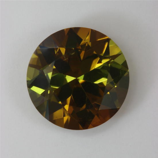 Round with Pie Slice of yellow green and gold This standard round brilliant has two slices of a/b color and two slices of c axis color. The lack of mixing keeps the round from being muddy. The clean stone weighs 3.31 carats.