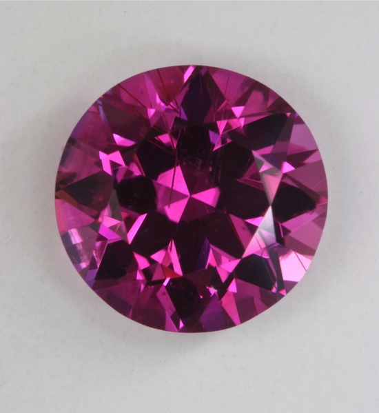 This standard round brilliant is a really hot pink that grabs the eye. It has good crystal and is eye clean except for a few growth tubes. It weighs 3.63 carats.