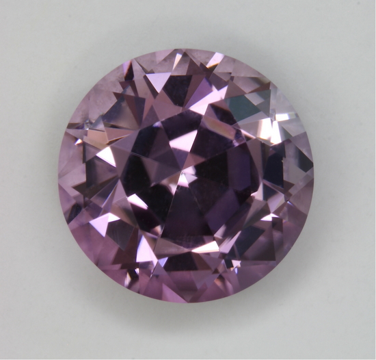 This is a beautiful standard round brilliant in a truly rare, well saturated, pastel lavender. It is cuprian and is slightly included. It has a fine medium tone level and weighs 2.68 carats.