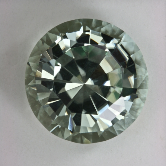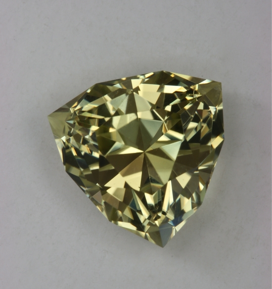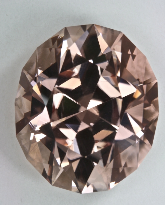 Sometimes everything goes right and a GEM is produced. This modified round has twelve horizontally split mains on the pavilion and eight modified step cut mains on the crown. This great cut along with great transparency and a fine polish, produced a GEM even when the finished gem has a rather pale brownish yellowish orangish color (ecru). No stone is bright and flasher under a wider range of conditions. She weighs 11.69 carats.