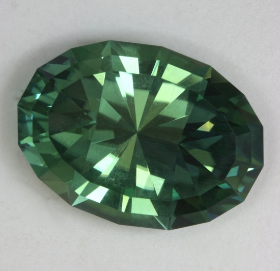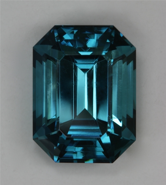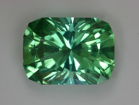 I like this gemstone. Its medium pale tone value and mint color make the deep gemstone a real flasher. Its deep cut is a combination of spit horizontal mains on the pavilion and a modified step cut on the crown. It has excellent crystal, is eye clean and weighs 14.37 carats.