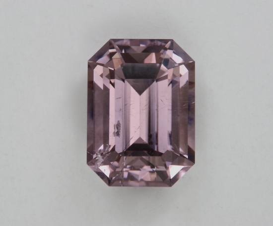 This is one of my best purples that does not contain copper. It has a medium light tone value with a bit of gray. Still its saturate is much better than most non cuprian purples. This emerald cut is included with a white non reflective inclusion in one corner. It weighs 1.62 carats.