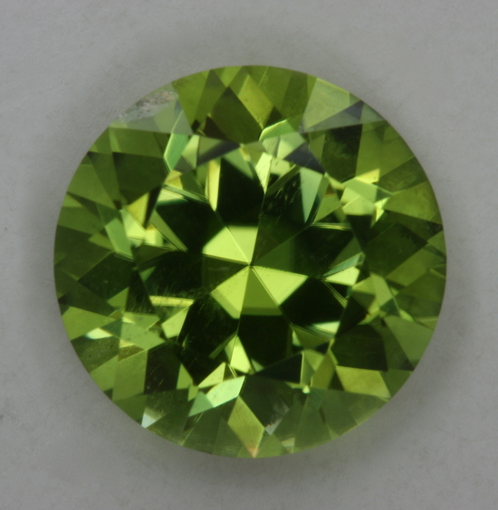 This is a gem. It has everything going for it including a really fine glow. It is only mildly dichroic and its color is dominated by the stronger c axis color of yellowish green. It has a medium tone value in a flawless heart. It weighs12.47 carats.