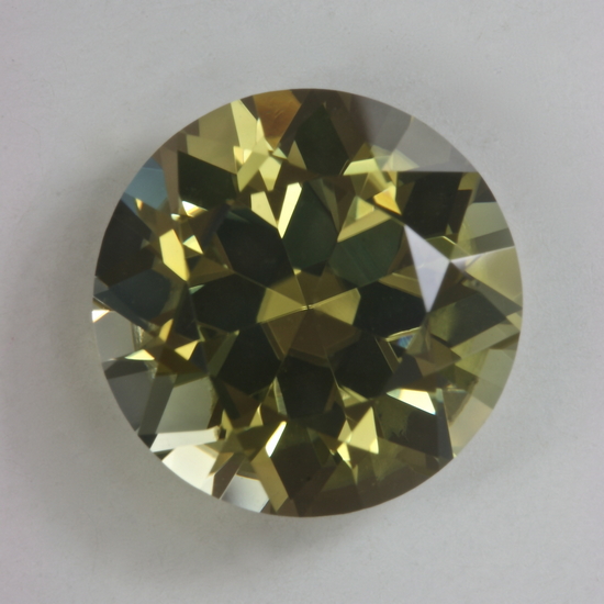 This standard round brilliant is a rather mild yellow with a wash of green. It appears to be eye clean and has fine crystal. Its larger size of 6.10 carats supports a medium tone level in this flashy gemstone.