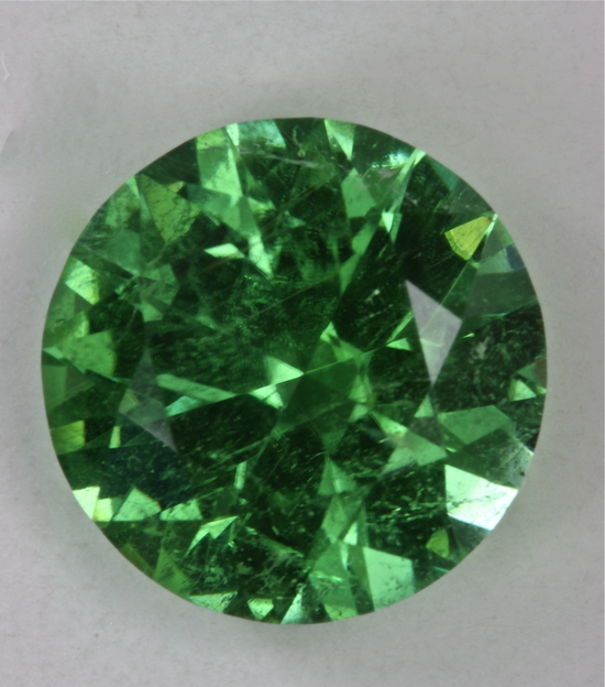 This standard round brilliant has an exceptionally bright medium green color. It is included, but they are really overwhelm by the beauty of this gemstone. It weighs 6.03 carats. Cuprian.
