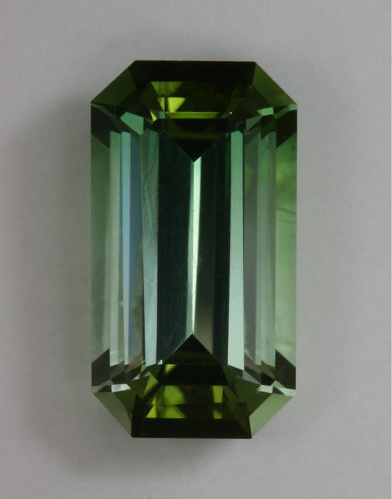 This attractive and interesting emerald cut is not a bicolor or tricolor.  It is just one bright acid green color displayed along the long axis of the stone from very pale to a dark tone.  There is a darker end in the emerald cut, next to the pale part, that comes from what I call the pagoda effect.  The color comes from the dark end and the stone guides the green color down the long axis of the stone to the lightly toned end where it emerges from the gemstone.  This effect can be strong enough to make you think that both ends of a graded gemstone like this have the same tone value of the color.
