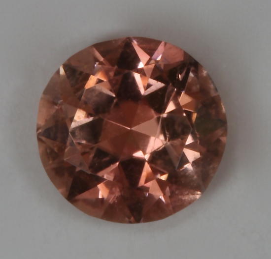 This  standard round brilliant has a really nice tone level of peach for such a small stone.  It is not brownish or dichroic at all.  It weighs .37 carats and is a dot of color.