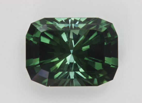 This cushion cut, which is a Barion, meet point design, partially developed by Mr. Graham, is one of the few more “modern” designs I use when cutting tourmaline.  I am a strong believer in simple traditional cuts and I add newer designs only when I feel they enhance yield or the dynamic interplay of tourmaline’s colors.  The mixing of the principal axis (c) color  with the other two axis (a and b)  lighter color is why I cut this spruce green tourmaline in a cushion rather than an emerald cut.  The principle draw back to the cut is the need to have a thick crystal to use it on,  especially if you use Mr. Graham’s original crown angles.  Of course you will also need a tourmaline with  “open  ends”,  i.e. good transparency looking down the c axis  (usually the longer, darker axis) of the crystal.