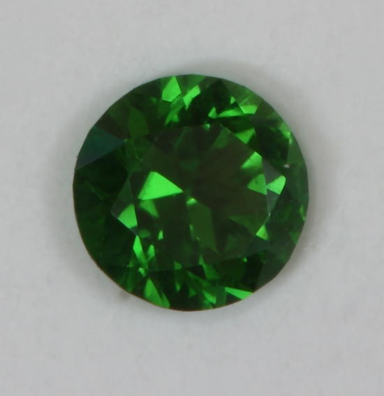 This standard round brilliant is almost the smallest gemstone in the collection. I cut it while I was experimenting with standard round brilliants to see how small I could cut a stone. It is a nice rich green with a touch of blue, that reminds me of some chrome tourmaline and it weighs .15 carats.
