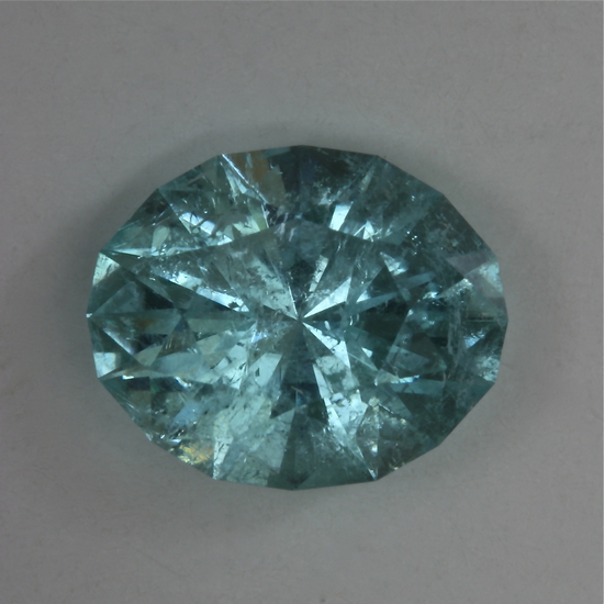 This oval's flash is effected by a multitude of tiny inclusions and a few feathers. Still its bright, medium light tone, aqua blue color makes the stone an eye grabber. It weighs 1.46 carats.