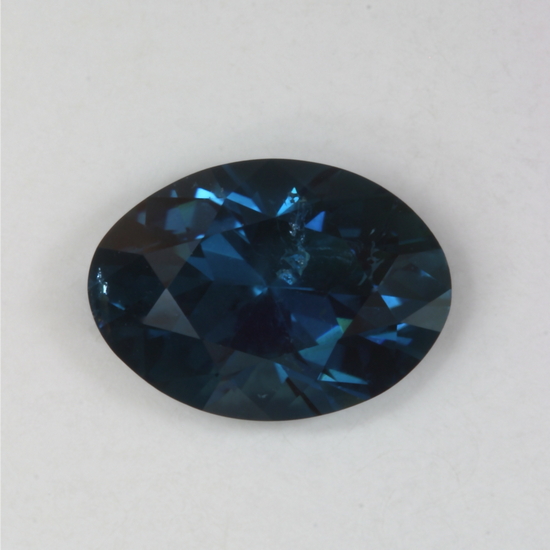 This vivid blue oval has inclusions under the table. They do not make marks and are well hidden by the stones rich tone level. It has good flash for a darker stone and weighs .83 carats