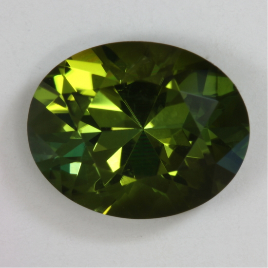 This spicy acid yellow green oval is lightly included. It has a flatter crown and weighs 2.79 carats.