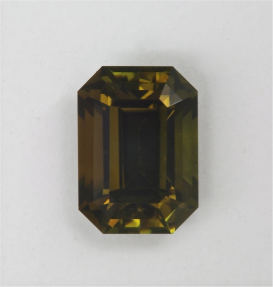 This smaller emerald cut appears to be eye clean and with good crystal. It has a medium dark tone value that still permits a good amount of flash. Its bronze color is uniform and attractive even if it is not eye candy. It weighs 1.24 carats.