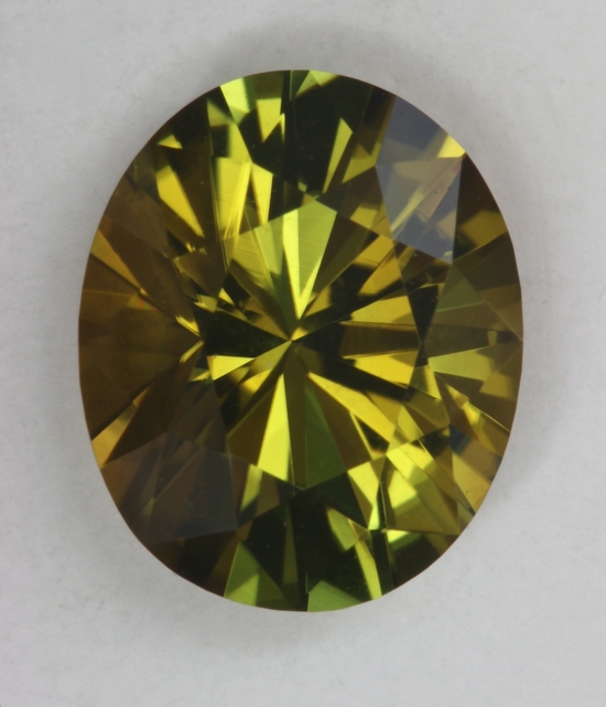 This eye clean oval has an attractive rich color of greenish gold. The darker toned stone still has good flash and weighs 3.04 carats.