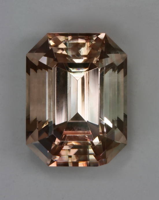 This eye clean emerald cut has the stronger peach dichroic ends and slightly brownish sides. It is eye clean and a bright flashy stone. It weighs 2.82 carats.