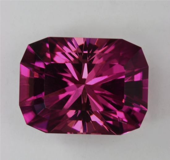 This gemstone is really a hybrid. It has a barion pavilion and a stepped top. The rich blackberry blush dominates the radiant flash. It has a great tone value and brilliant flash. It is eye clean and weighs 4.35 carats.