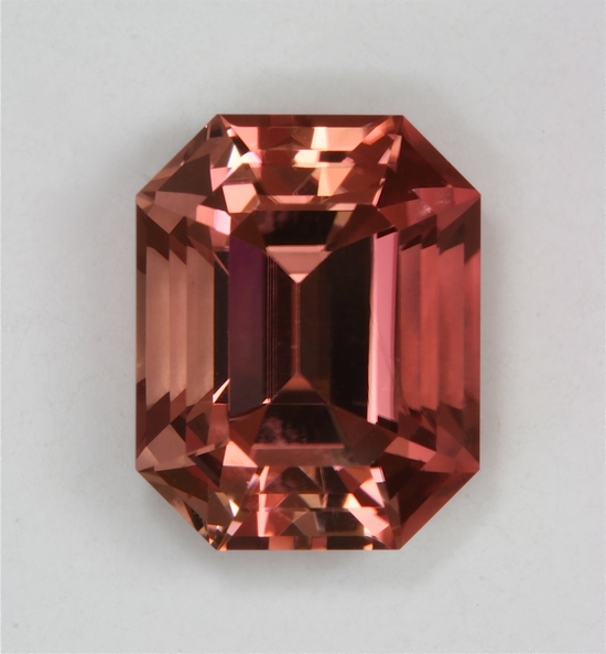 Fine medium rich reddish peach. It is bright and flashy and appears to be eye clean. It weighs 3.04 carats.