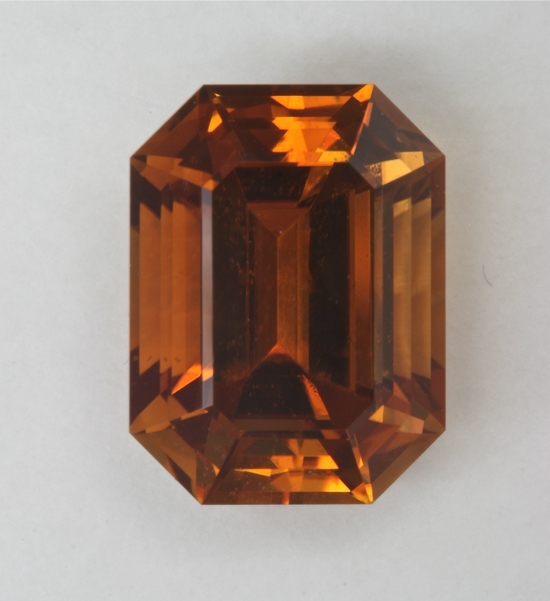 This emerald cut has extra facets to show off a truly great uniform orange color with golden brown over tones. It is both rich and hot at the same time. It appears to be eye clean and with fine crystal. It weighs 4.50 carats