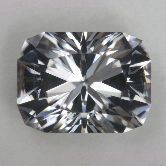 This material was probably heated. It is a bright light gray Barion cushion and weighs 5.38 carats.