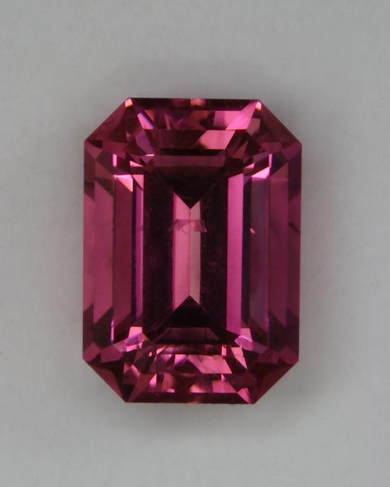 Nice even vivid pink color in a smaller emerald cut. It appears to be eye clean and with good crystal. It weighs 1.26 carats.