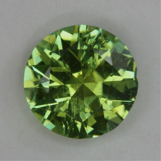 Bright acid green with a yellower principle axis that floats around the standard round brilliant. It is included, but still eye candy. It weighs .93 carats.
