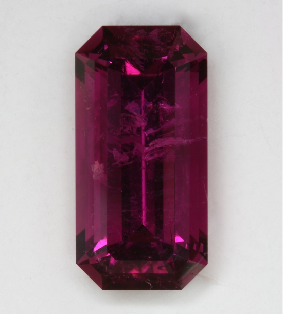 Long ratio emerald cut has moderate inclusions. Its red color has a significant amount of purple. It weighs 1.76 carats.