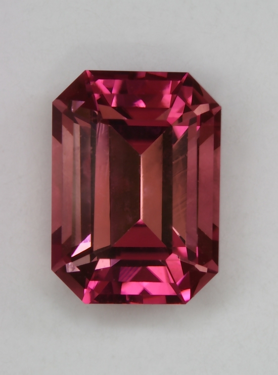 This smaller emerald cut has it best rich pink in the ends. Everything flashes because the gemstone is eye clean with fine crystal. It weighs 1.19 carats.