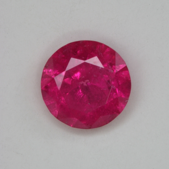 This gemstone is here because of the saturation of its vivid pink color. It does have some muted flash, but its optical properties are not good. Still this round is such a bright piece of eye candy. It weighs .78 carats.