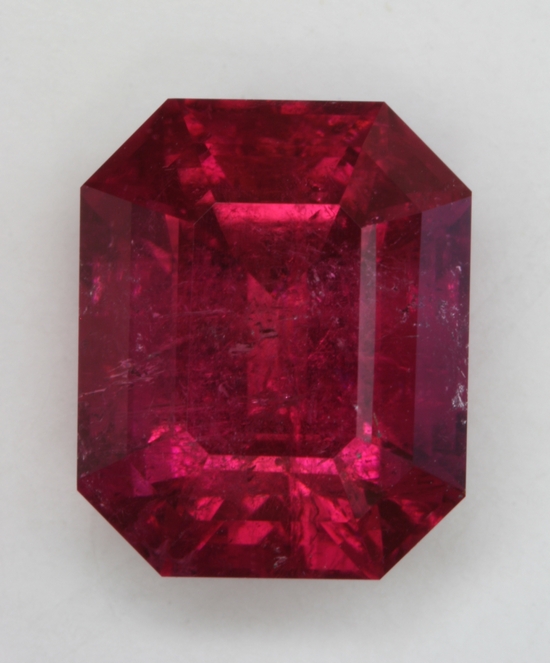 This emerald cut has extra facets for depth and flash. Unfortunately the flash is diminished by an evenly distributed field of inclusions. Still the color is definitely on the red side of pink and that makes it worth faceting. It weighs 5.83 carats.