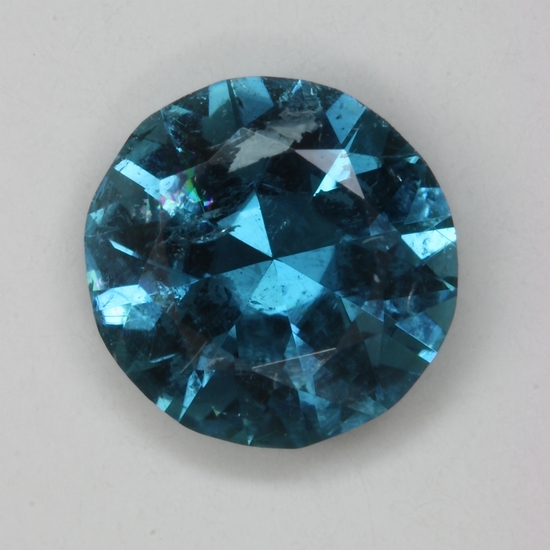 I certainly worked to get the most beauty out of this smaller standard round brilliant. The stone has a flatter crown that helps the medium toned vivid blue stone sparkle and a retained, noticeable white inclusion half down the side of the crown. This flaw is white and does not flash, so it is not too distracting. It weighs .72 carats,
