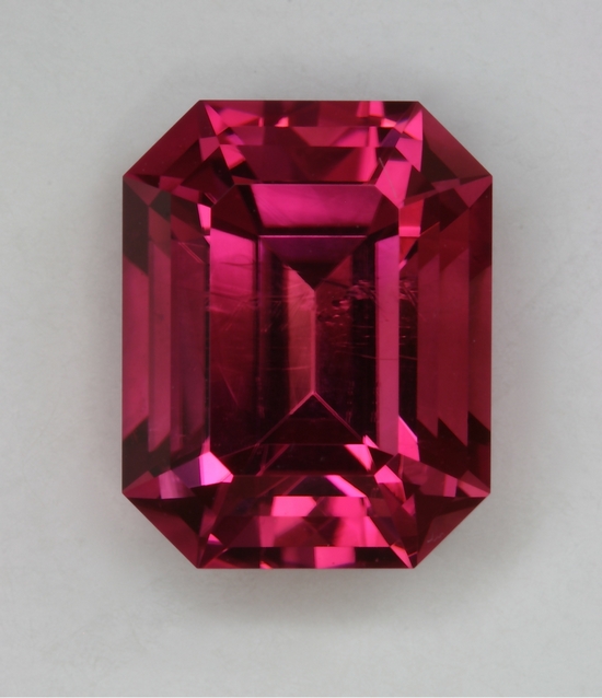 This richly toned pink/red emerald cut has fine crystal and only minor inclusions under the table. It is a beautiful gemstone that weighs3.46 carats.