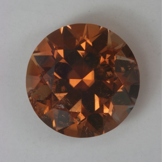 This standard round brilliant has white inclusions on one side of the stone that do not extend under the table. They effect the gemstone very little. Its bright, crisp,medium toned orange without brown is very nice. It weighs 3.15 carats.