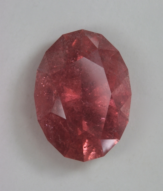Not a good quality gemstone in the clarity area, but the color demanded that I treat it nicely. It is really a refreshing melon and it weighs 2.55 carats.