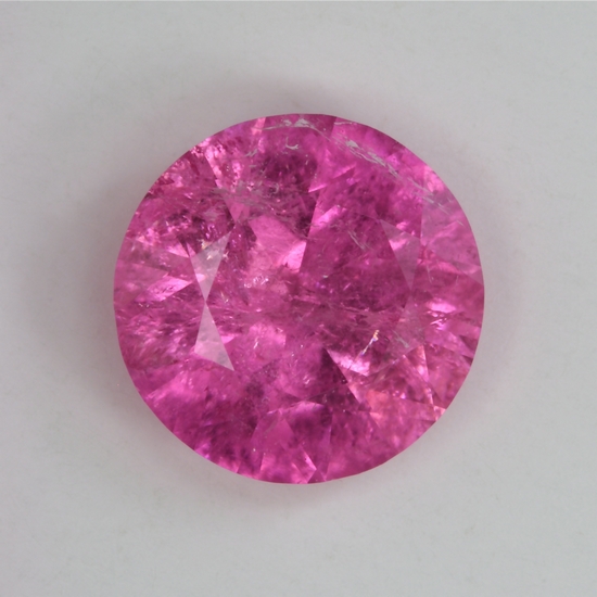 This beautiful standard round brilliant has a sea of inclusions, but its great pink grabs the eye. It could not be hotter. It weighs1.37 carats.