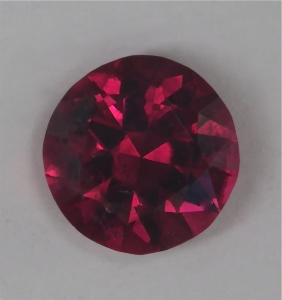 A vivid, rich red standard round brilliant with its only flaws toward the girdle and not under the table is very nice. It looks substantial for such a small gemstone. It weighs .35 carats.