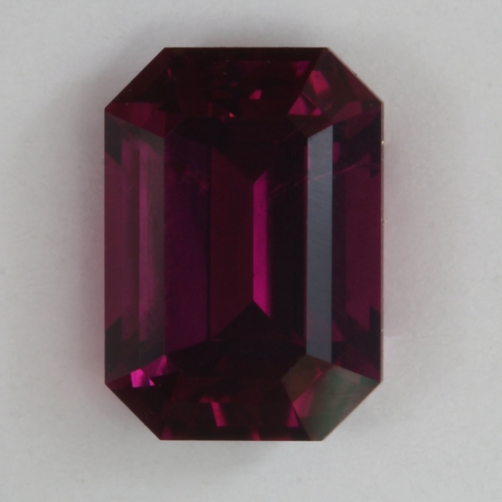 This emerald cut is not eye candy. Its deeper red color with a touch of purple states its case without playing around. It is included, but the feathers are hard to see in the rich red flash of the stone. It weighs .92 carats.