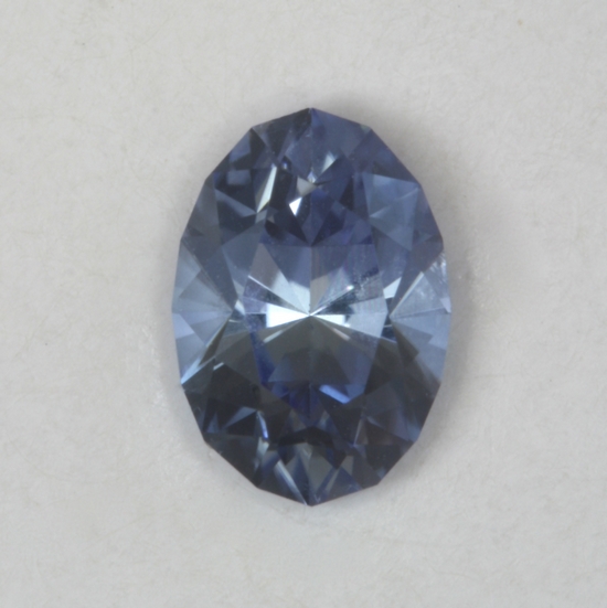 There is a slight overtone of purple in the pale pastel blue color of this oval. It appears to be eye clean and with a moderate amount of bright flash. It weighs.57 carats and is cuprian.