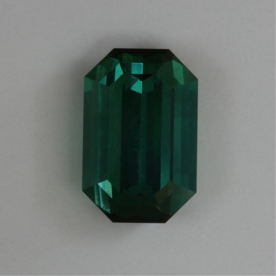 This eye clean darker toned emerald cut has dark and flashing bands that are produced by the steep ends. I cut the steep ends to minimized the effect of a closed c axis on the brightness of the gemstone. It weighs .89 carats.