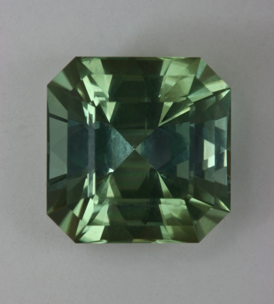 This square gemstone is deeply cut because they are Barions. The green is only weakly dichroic and of a medium pastel tone level. It appears to be eye clean and weighs 5.18 carats.