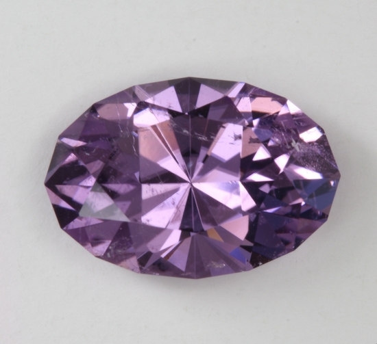 I like this gemstone for its rare color, a decently saturated purple and clarity. The faint feathers have little impact on the gemstone. It has a nice medium tone level, moderate quality of crystal and decent flash. This cuprian oval weighs 2.10 carats.