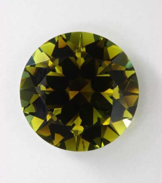 This olive colored standard round brilliant has a medium dark tone value. It appears to be eye clean and with great crystal. Its flashy olive color only needs a pimento to make it complete. It weighs 8.07 carats.