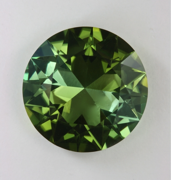 This is a GEM despite being cut with the table parallel to the c axis, so both dichroic colors are shown in pie slice shapes face up. As you turn it you get an eye full of a paler pastel bluish green followed by a richer grass green. Both colors are vivid. The gem weighs a hefty 8.36 carats.