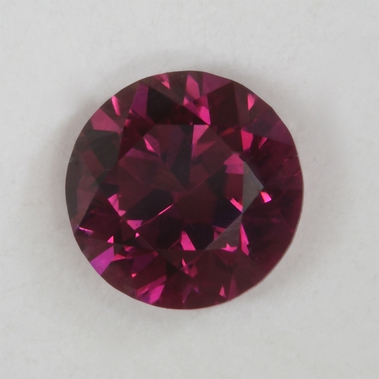 This smaller standard round brilliant appears to be eye clean. The dark factors in its medium tone level keep the pink stone from being brighter with more flash. It weighs .77 carats.