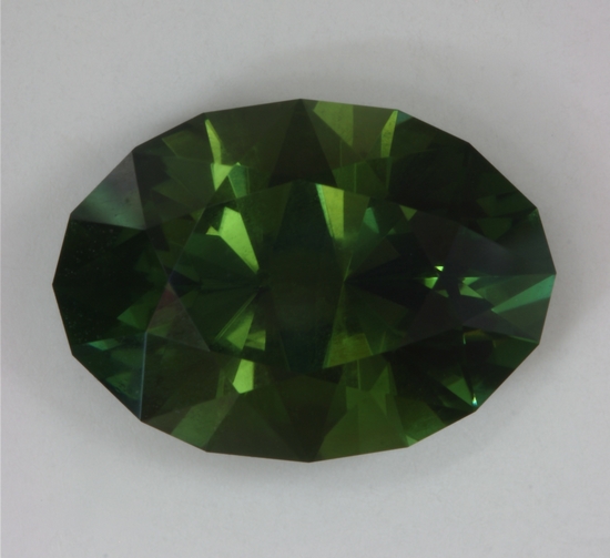 I like this darker green oval. It was cut with the lighter more colorful secondary axis down the length of the oval. The primary axis, which does not allow much light to pass, is across the oval. This produces bright flashy ends with a fine green color in the ends of the oval and a dark mysterious center that refuses to respond. This stone appears to be eye clean and weighs 5.95 carats.