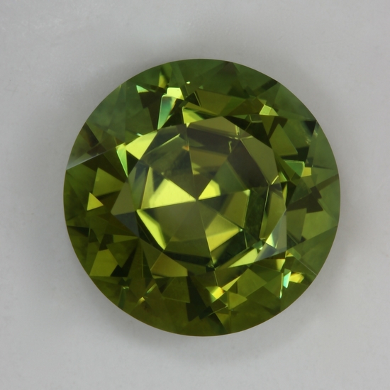 This round with a horizontal split main pavilion and a regular crown is a rich yellow green. It appears to be eye clean and has fine crystal. This bright flashy gemstone weighs 6.82 carats.
