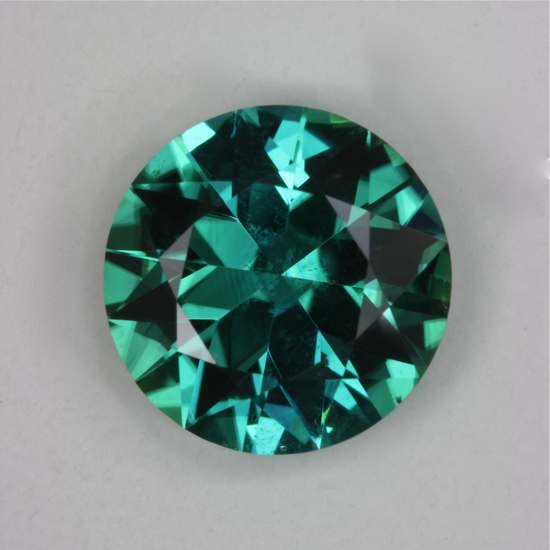 This uniformly, teal colored standard round brilliant has a great medium tone level. And great flash and crystal too. It weighs a beautiful 2.84 carats of vivid color.