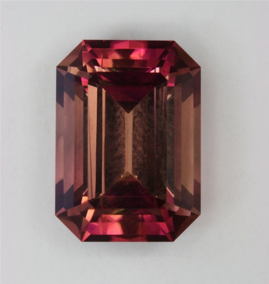 This beautiful, bright, flashy emerald cut has rich pink ends and more orangish sides. It has outstanding crystal and is eye clean. It weighs 7.40 carats.