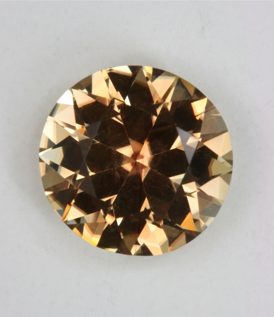 This bright flashy standard round brilliant is a yellowed brown orange that I call tea color. It is slightly included, but that is hardly noticeable. It has a fine medium tone level and fine crystal. It weighs 2.64 carats.