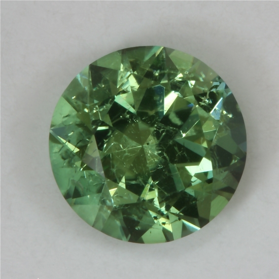 This standard round brilliant is a really clean green with a spec of blue color. It is included and they do effect the flash of the stone. Its crystal is below average, but it is still a pretty gem at .77 carats.