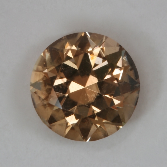 This standard round brilliant slides with the light and is a mixture of orange, gold and brown. It has a medium light tone level and appears to be eye clean. This flashy gem weighs .89 carats.
